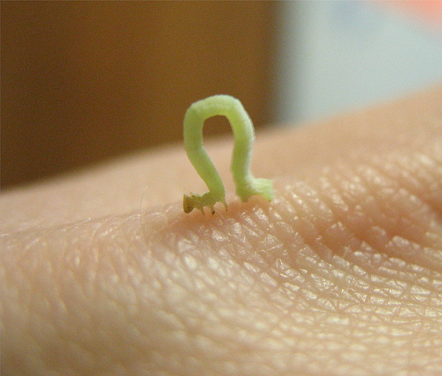 Deep in long retreat, on my favourite bench under the sheltering boughs of an oak, an inch-worm drops onto my arm.